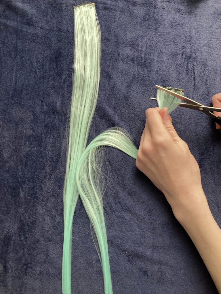 Start by cutting the hair to the length that you want, keeping in mind that your tail will be half as long as the hair, since you fold the strands in half. Cut off any mesh or thread that is attached to the hair. I used synthetic hair extensions for this, so I had to cut off the clip at one end. I also wanted a tail that would rest on the floor when the doll stands, so I measured out a length that was more than double the length of the legs.