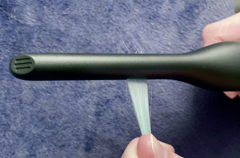 Now, nylon hair resists bending, so I found I had to create a kink in the fibers using a flat iron in order to pull them through the tail. Find the middle point of the hair, and, using a small amount as a time, fold the hair and iron over it to create a distinctive bend.
