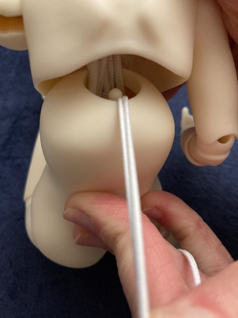 Use a piece of scrap elastic to pull the tail elastic into the body. This is way easier if you unstring the top of the doll from the torso piece, otherwise the chest gets super in the way.